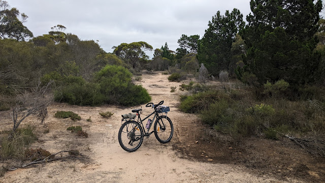 On the last day in Milang I rode my bicycle up the Nurragi Reserve, which was a rail trail but not really. It followed the old railway which once ran from Strathalbyn to Milang, but the path was complicated by regular stiles over which I had to heft my bicycle. Then I got slightly misplaced while dodging a patch of puncture-inducing goatheads (caltrop, if you're a South Aussie) and ended up in the revegetation section beside the trail, which resulted in quite a lot of walking. By the time I reached the next road and ate my banana it was time to go home because I had a date with the Devonshire Tea served by the Milang Railway Museum volunteers, so I took the road home to ensure that there would be no hefting involved in the return journey